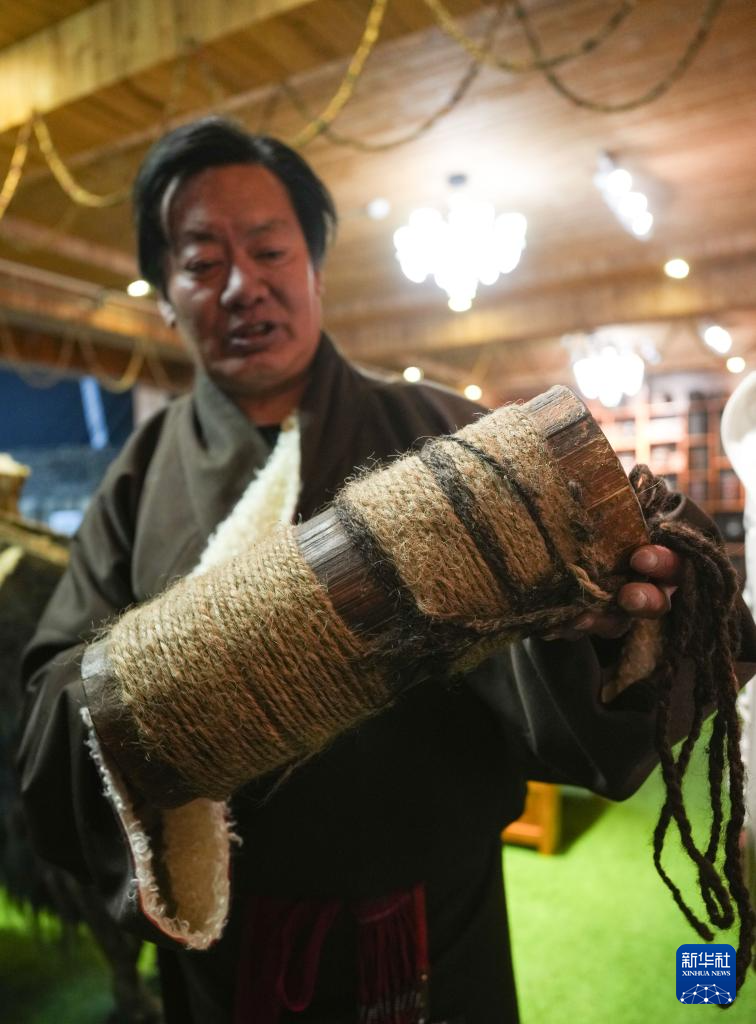 當(dāng)?shù)孛袼讓?zhuān)家貢布洛旺在“牧人寶庫(kù)”藏式茶館展示擠羊奶用的木桶(2月13日攝)。新華社記者 晉美多吉 攝