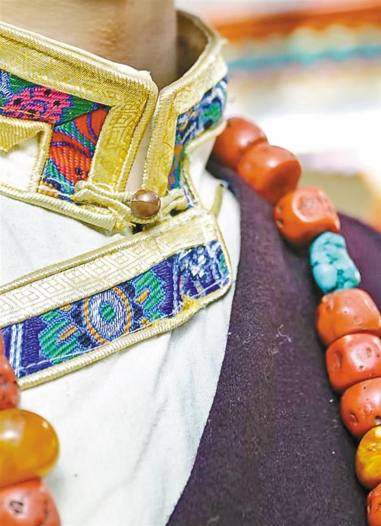 男士們大多身著用家織氆氌制作的藏袍,以黑、白色為主,領口、袖口、下擺等位置鑲嵌著精美的“十”字紋花邊。他們頭戴金花帽,腳穿“松巴”鞋,整個裝扮既展現(xiàn)了高原男子的粗獷與豪放,又透露出一種對細節(jié)的極致追求。女士們的服飾則更加豐富多彩,她們穿著黑色氆氌藏袍,內(nèi)搭彩色襯衫,系著彩虹條紋的“邦典”,已婚女子還會將各色絲線編入頭發(fā)中形成發(fā)辮,恰似高原上綻放的花朵。