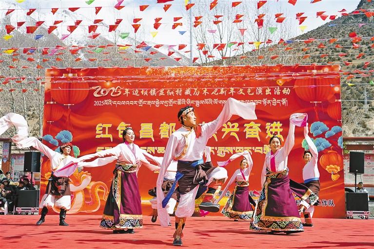 2月28日,全國(guó)“村晚”示范點(diǎn)昌都市邊壩縣顯俄村熱鬧非凡,一場(chǎng)以“紅色昌都·振興奮進(jìn)”為主題的“村晚”文藝演出在此舉行,吸引了1000余名群眾觀看?;顒?dòng)現(xiàn)場(chǎng),各族群眾身著盛裝,共同欣賞這場(chǎng)文化盛宴。演出人員用優(yōu)美的舞姿、歡快的節(jié)奏,為觀眾帶來(lái)一場(chǎng)活力與激情四溢的視聽(tīng)享受。