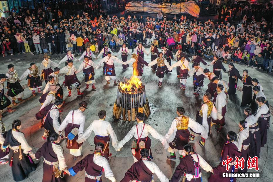 4月1日晚,西藏自治區(qū)林芝市第二十二屆桃花旅游文化節(jié)波密縣分會場的篝火鍋莊晚會熱鬧開場。晚會現(xiàn)場,熊熊篝火照亮夜空,當(dāng)?shù)孛癖娚碇?jié)日盛裝與游客手拉手,圍繞篝火跳起歡快的鍋莊舞,舞步輕盈、姿態(tài)優(yōu)美。熱情奔放的旋律,洋溢著濃郁的民族風(fēng)情,讓現(xiàn)場變成歡樂的海洋。此次活動不僅展現(xiàn)了波密獨特的民俗文化魅力,也為桃花節(jié)增添了別樣色彩,吸引更多游客領(lǐng)略林芝波密縣春日盛景與人文風(fēng)情。圖為篝火鍋莊晚會現(xiàn)場。(無人機(jī)照片)
