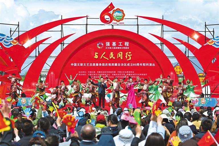 上午10時整,“與人民同行”中國文聯(lián)文藝志愿服務(wù)團(tuán)慶祝西藏自治區(qū)成立60周年慰問演出,在歌舞《鼓舞西藏》的熱烈氛圍中正式開場。