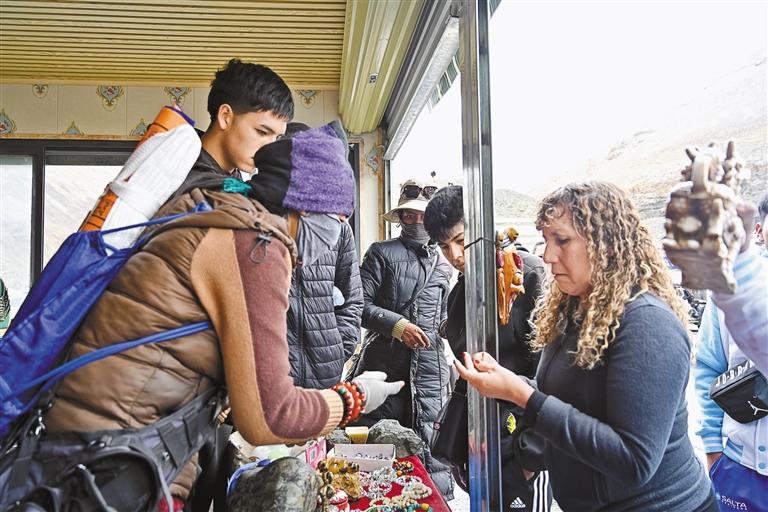 新奇感過后,游客們開啟購物模式?!鞍⒓?,這個(gè)掛飾可以定制嗎?”“你們可以發(fā)快遞嗎?”對(duì)于一連串的問題,阿佳格桑忙碌地一一回答著,“你們想要什么圖形,我們就給你定制什么圖形?!薄拔覀冞@兒快遞很快,今天下單明天就給你發(fā)!”短短半個(gè)小時(shí),“阿佳格桑工坊”的生意火爆,銷售藏式靠墊、藏式地毯、掛飾等特色產(chǎn)品4000多元。“回去后,我要通過自媒體平臺(tái),宣傳這次西藏之旅的所見所聞,讓更多親朋好友來西藏旅游!”日本游客琴音有感而發(fā)。