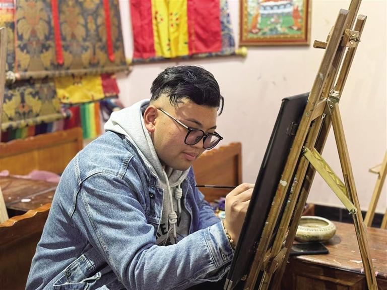 只見占地不到20平方米的小屋內(nèi),擺放著各類唐卡畫作。既有傳統(tǒng)唐卡作品,亦有動(dòng)畫人物的“繪像”。描邊的金屬絲和光滑的質(zhì)感表面讓人忍不住駐足欣賞。店里陳列著巴掌大小的掐絲唐卡,金線掐絲在礦物顏料映襯下流光溢彩。畫師兼老板的南吉合多杰正在完成一份岡仁波齊的客單:“勉薩畫派的特色是線條細(xì)膩,顏色過渡自然。選好圖案后,會(huì)根據(jù)載體材質(zhì)、大小(例如石頭大小、木板長短等)收費(fèi)?!彼贿呎f著,一邊用特制工具將顏料注入金絲隔斷。