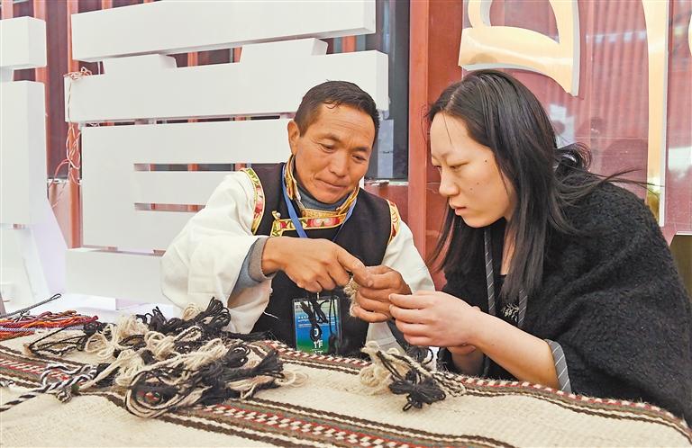 圖為游客(右)在體驗(yàn)牦牛毛編織技藝。記者 旦增蘭澤 攝