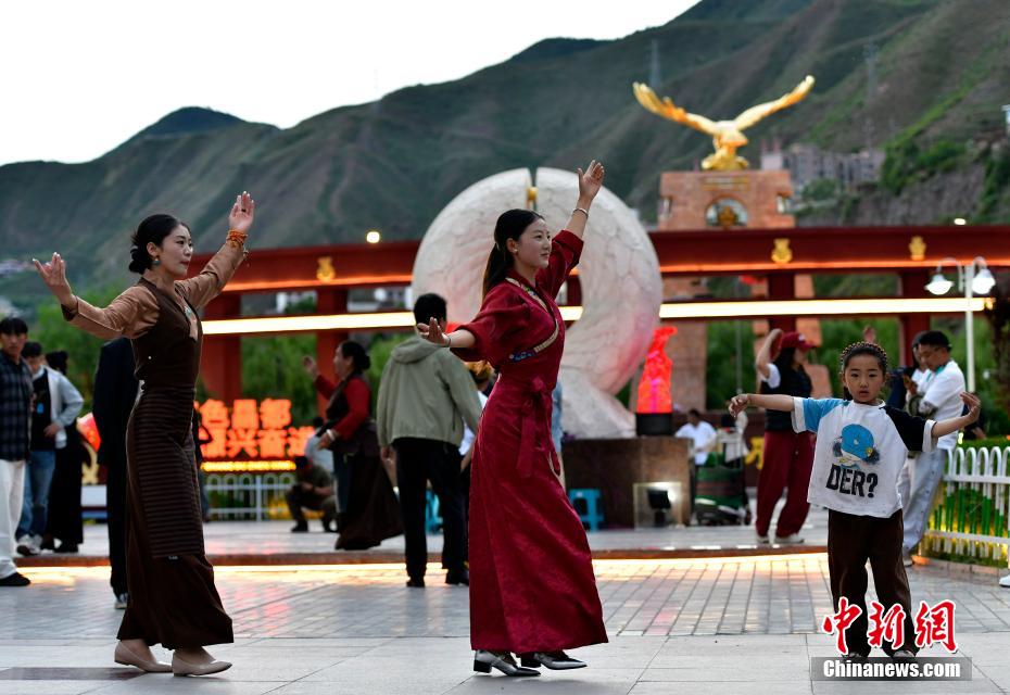 7月13日,西藏昌都瀾滄江天津廣場(chǎng)上,鍋莊舞愛好者踏歌起舞,舞出夏日夜間精彩。