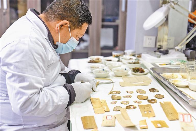 圖為布達(dá)拉宮貝葉經(jīng)實(shí)驗(yàn)性修復(fù)小組實(shí)驗(yàn)室工作人員對(duì)貝葉進(jìn)行處理。 新華社記者 旦增尼瑪曲珠 攝