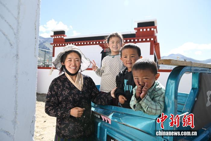 2025年8月15日,西藏日喀則市定日縣森嘎村舉行“定日6.8級地震災后恢復重建民房首批入住儀式”。圖為森嘎村一戶村民一家在新房門口。中新社記者 貢嘎來松 攝