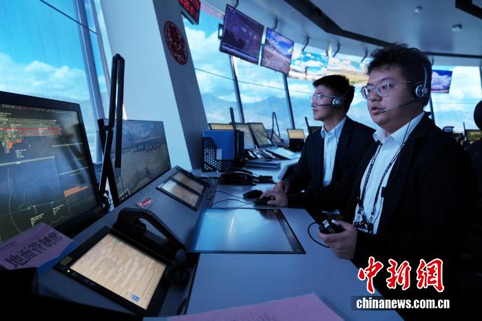 2025年7月22日,塔臺管制室?guī)О嘀魅蔚┰?左,藏族)與見習管制員管羽揚(右)在拉薩貢嘎國際機場塔臺指揮航班進離場。據(jù)悉2025年是西藏自治區(qū)成立60周年,也是西藏民航通航60周年。中新社記者 張祥毅 攝