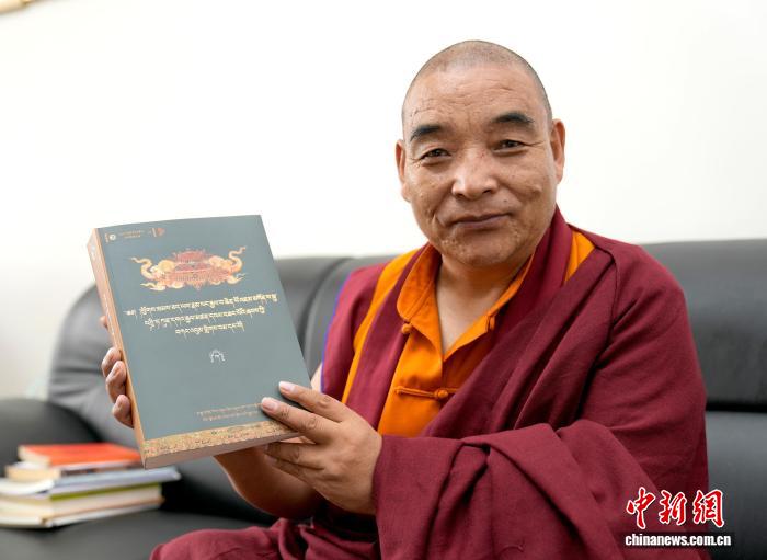 圖為班典頓玉展示其主編的珍貴藏文古籍叢書《薩迦噶彭寶典寶庫(kù)》。李林 攝