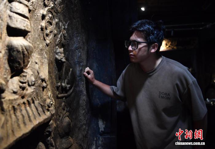 鄉(xiāng)城縣宗薩木府的主人洛絨澤仁介紹藏式香巴拉貓泥塑。 記者 王磊 攝