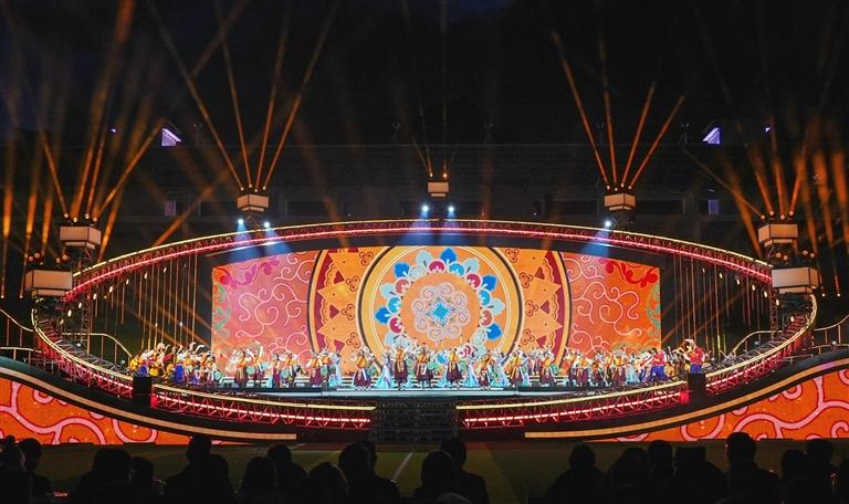 舞臺設計同樣暗藏巧思,主體采用巨型“同心圓”架構,設計中巧妙嵌入藏族傳統(tǒng)建筑的經典紋樣,同時將山南的人文風貌與山水景致融入其中,讓地域特色與藝術美學自然交融。