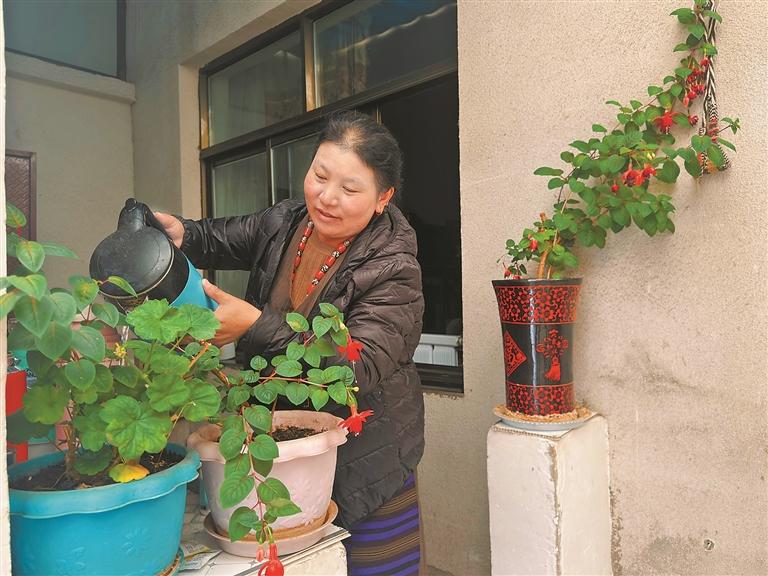 圖為那曲市林廓社區(qū)居民斯曲在自家陽(yáng)光房里整理花卉。記者 萬(wàn)靖 攝
