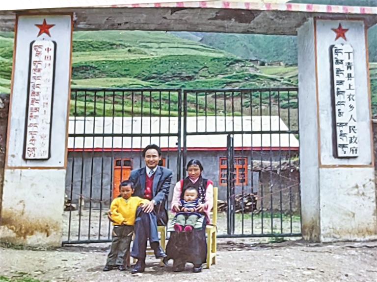 1988年,阿旺慈誠(chéng)和妻子、孩子在上衣鄉(xiāng)政府門前的合影。(圖片由受訪者提供)