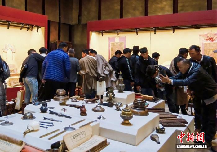 圖為觀眾正在欣賞展覽中的藏品。西藏唐卡藝術博物館供圖