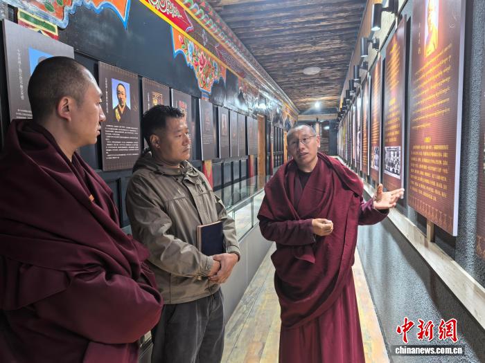 圖為結(jié)古寺僧人頓珠才仁(右一)向參觀(guān)者講解展館內(nèi)容。中新網(wǎng)記者 胡貴龍攝