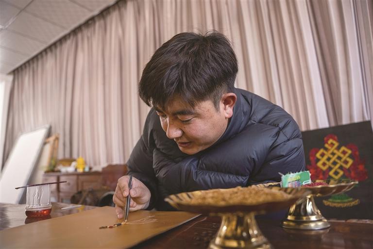 如今,仁青多吉依然在唐卡繪制與青稞文創(chuàng)之間忙碌著。陽光掠過他剛完成的一幅作品,黑頸鶴的棕褐色喙部、漸變棕灰的羽翼在光影下栩栩如生,一粒粒青稞如同被賦予了生命,靜靜訴說著林周的生態(tài)與農(nóng)耕故事。工作室里,畫師們偶爾會停下手中的筆,圍過來看他的創(chuàng)作進(jìn)度,時不時交流幾句,歡聲笑語間,傳統(tǒng)技藝的火種在默契中傳遞。