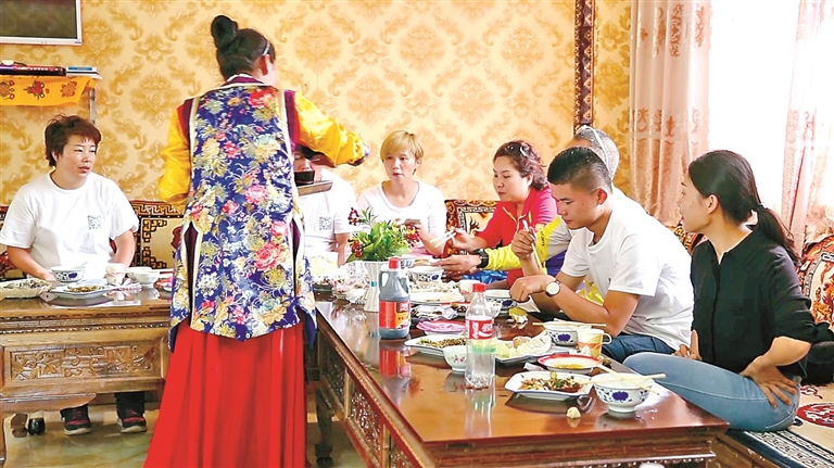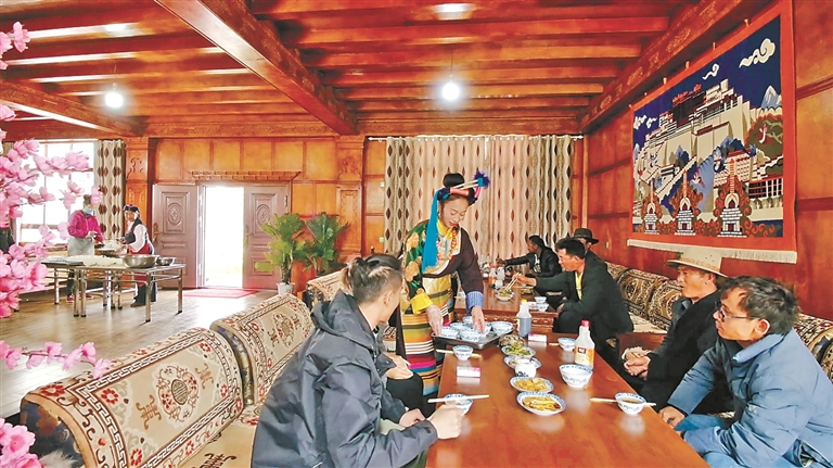 作為自治區(qū)級(jí)非遺傳承人、芒康縣“婦女致富帶頭人”的卓瑪拉姆,于2010年開辦鹽井果拉叢農(nóng)家樂,憑借著正宗的加加面風(fēng)味和熱情的服務(wù),逐漸積累了口碑。2012年,在各級(jí)政府的支持下,她采用“民族特色餐飲+鄉(xiāng)村旅游接待”的經(jīng)營模式,生意日益紅火。2017年,通過貸款300萬元、自籌160萬元翻建了農(nóng)家樂,將其升級(jí)為綜合型的民族特色餐飲店,經(jīng)營規(guī)模大幅擴(kuò)大,最多時(shí)日接待游客達(dá)300余人。