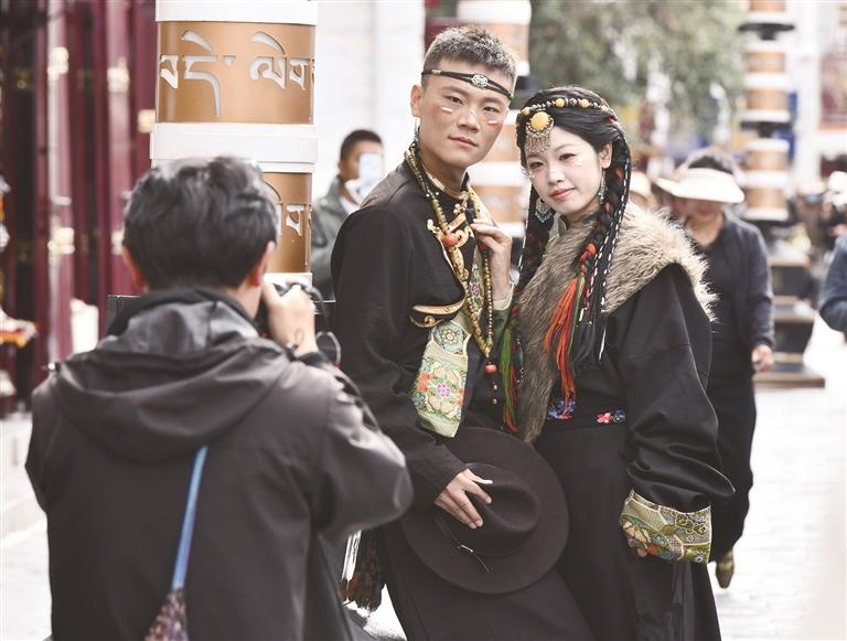 游客穿著藏裝在八廓街拍攝寫(xiě)真。西藏日?qǐng)?bào)記者 旦增蘭澤 攝