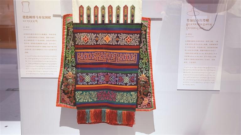 在藏北牧區(qū),婦女們佩戴的飾件“馬牙邦典”也別具一格。這種五彩圍裙上端,堆貼著豎條裝飾,形狀酷似馬的牙齒,故而得名。在這件展品的背后,還藏著一個(gè)家族兩代人對(duì)技藝的堅(jiān)守與傳承,它不僅是裝飾品,更是牧區(qū)文化與情感的象征。