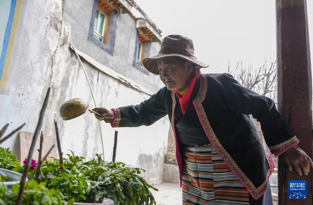 卓瑪吾珠在家中給花澆水(3月16日攝)。新華社記者 晉美多吉 攝