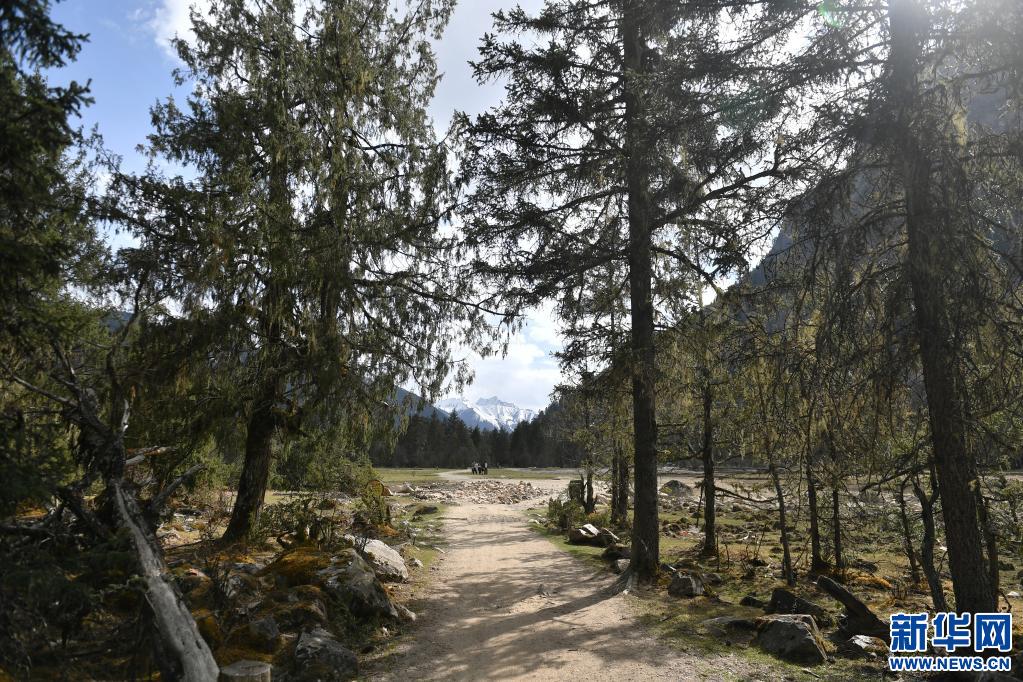 這是5月1日在西藏林芝市工布江達(dá)縣拍攝的通向新措的林蔭小道。新華社記者 孫瑞博 攝