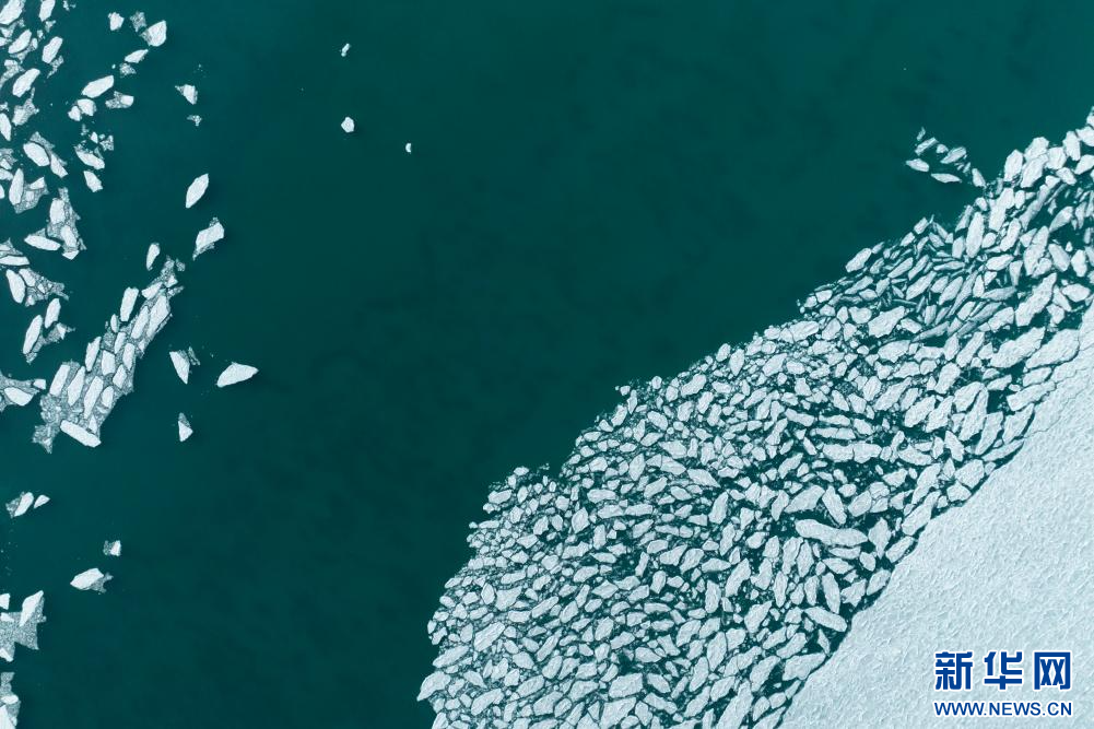1月29日拍攝的瑪旁雍錯(cuò)湖面上的冰堆積在一起,呈現(xiàn)出各式各樣的造型(無人機(jī)照片)。新華網(wǎng) 旦增努布 攝