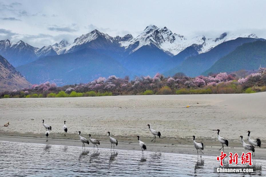 4月,在西藏林芝,遠處的雪山、綻放的桃花和水邊休憩的黑頸鶴構(gòu)成一幅和諧美好的春日畫卷。圖為林芝市派鎮(zhèn)拍攝到的黑頸鶴。