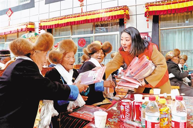 圖為山南市瓊結(jié)縣各單位在縣集中供養(yǎng)中心聯(lián)合舉辦慶元宵活動(dòng),為供養(yǎng)中心老人分發(fā)保暖衣物。記者 洛桑 通訊員 次仁龍布 攝