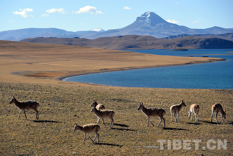 湖濱河畔,地勢(shì)平坦開(kāi)闊,水草豐盛甜美,是藏羚羊頻繁活動(dòng)的場(chǎng)所。藏羚羊是一種善跑的動(dòng)物,跑起來(lái)輕快灑脫、疾如長(zhǎng)風(fēng),時(shí)速可達(dá)80公里。
