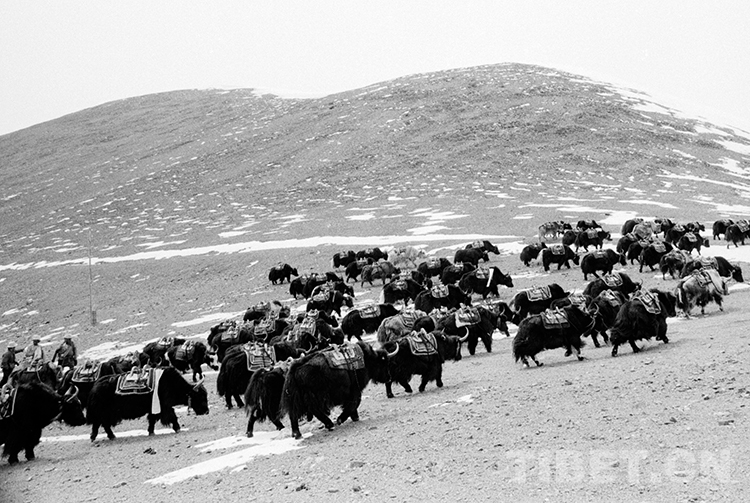 這是馱鹽隊牧民趕著成群馱牛前往藏北無人區(qū)的鹽湖去馱鹽(唐召明1988年攝)