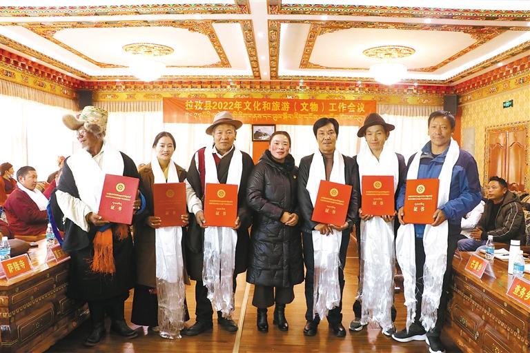 會議總結了拉孜縣2021年度文化和旅游(文物)相關工作,向8家文化企業(yè)發(fā)放了市級文化產業(yè)示范基地牌子;7支藏戲隊發(fā)放藏戲傳習點牌子;30家文保單位發(fā)放了文保單位全景圖;8名非遺傳承人發(fā)放了非遺傳承人證書。