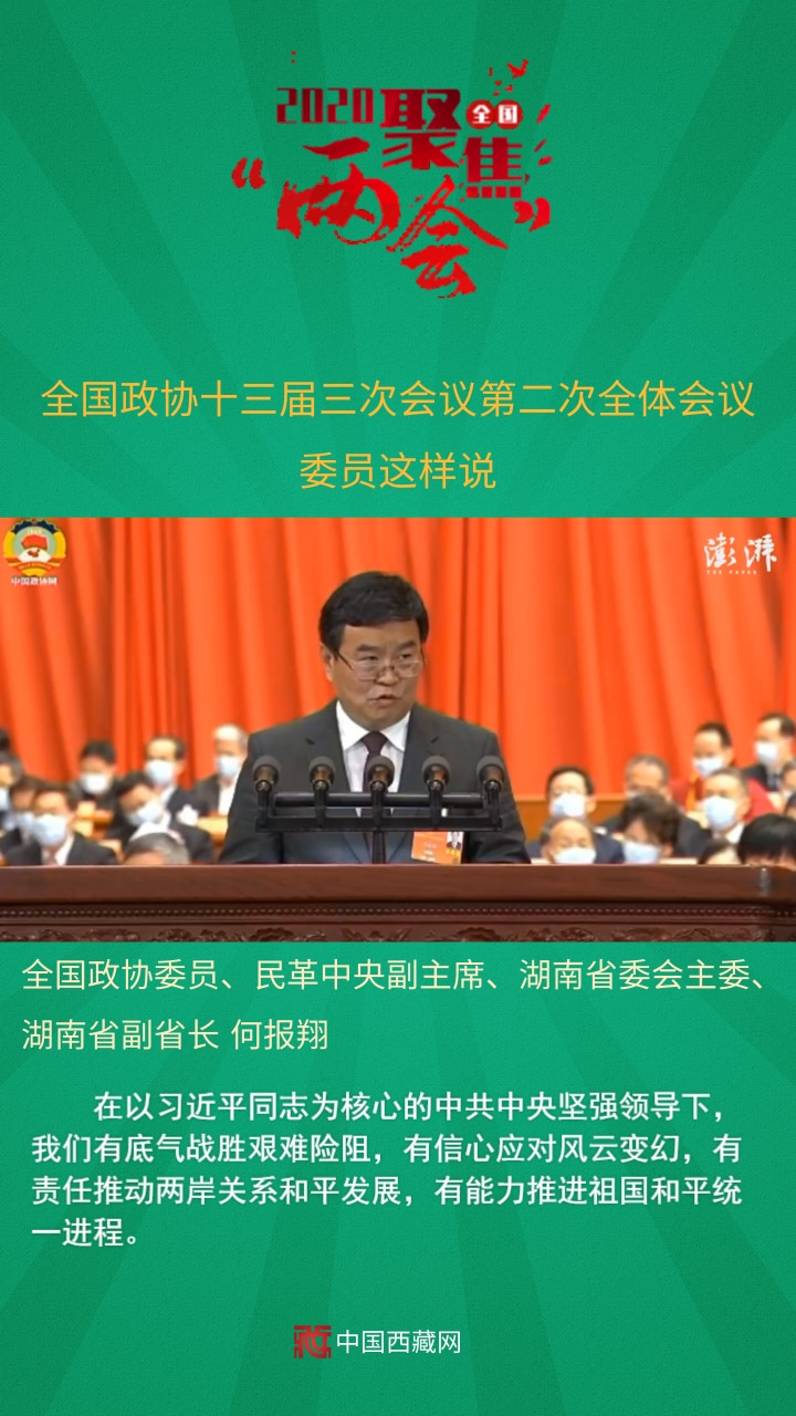 全國政協(xié)委員、民革中央副主席、湖南省委會(huì)主委、湖南省副省長何報(bào)翔發(fā)言說,在以習(xí)近平同志為核心的中共中央堅(jiān)強(qiáng)領(lǐng)導(dǎo)下,我們有底氣戰(zhàn)勝艱難險(xiǎn)阻,有信心應(yīng)對(duì)風(fēng)云變幻,有責(zé)任推動(dòng)兩岸關(guān)系和平發(fā)展,有能力推進(jìn)祖國和平統(tǒng)一進(jìn)程。