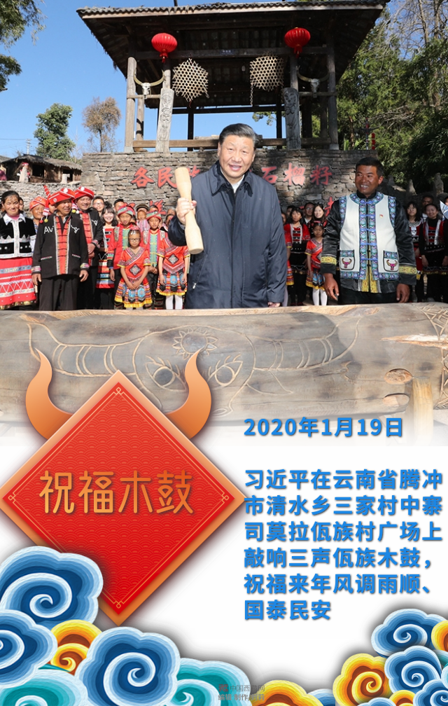 習(xí)近平在云南省騰沖市清水鄉(xiāng)三家村中寨司莫拉佤族村廣場(chǎng)上敲響三聲佤族木鼓,祝福來年風(fēng)調(diào)雨順、國(guó)泰民安