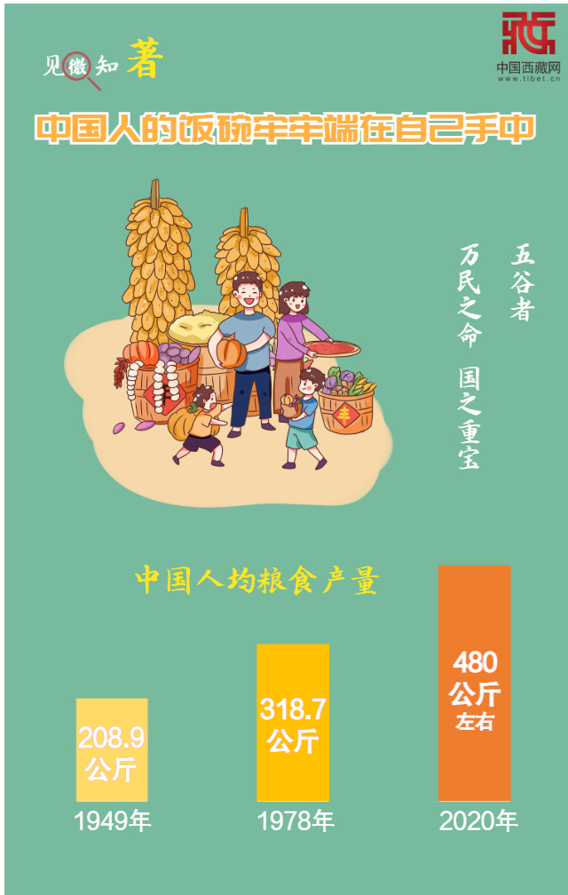 民以食為天。2020年,我國(guó)糧食又高位增產(chǎn),供需總量基本平衡。中國(guó)人均糧食產(chǎn)量,從1949年的208.9公斤,到1978年的318.7公斤,再到2020年的480公斤左右,高于400公斤的國(guó)際糧食安全標(biāo)準(zhǔn)線。中國(guó)人的飯碗牢牢端在自己手中。(中國(guó)西藏網(wǎng) 制圖/楊月云)