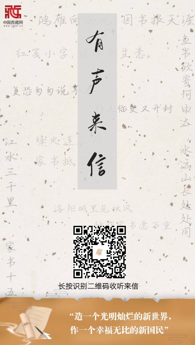【編者按】穿越歲月長(zhǎng)河,翻開一封封紅色家書,感受筆端下的家國(guó)情懷和人間煙火。一紙書信明志向,一紙書信道親情,家書中浸透著硝煙與血汗,澎湃著奮斗與信仰,在中國(guó)共產(chǎn)黨成立100周年之際,中國(guó)西藏網(wǎng)推出融媒體產(chǎn)品[有聲來(lái)信],從紙短情長(zhǎng)中重溫波瀾壯闊的歷史,感悟革命先輩的心路情懷。本期內(nèi)容為:造一個(gè)光明燦爛的新世界,作一個(gè)幸福無(wú)比的新國(guó)民