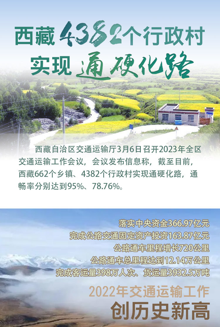 西藏自治區(qū)交通運(yùn)輸廳3月6日召開(kāi)2023年全區(qū)交通運(yùn)輸工作會(huì)議,會(huì)議發(fā)布信息稱,截至目前,西藏662個(gè)鄉(xiāng)鎮(zhèn)、4382個(gè)行政村實(shí)現(xiàn)通硬化路,通暢率分別達(dá)到95%、78.76%。 [詳細(xì)] -