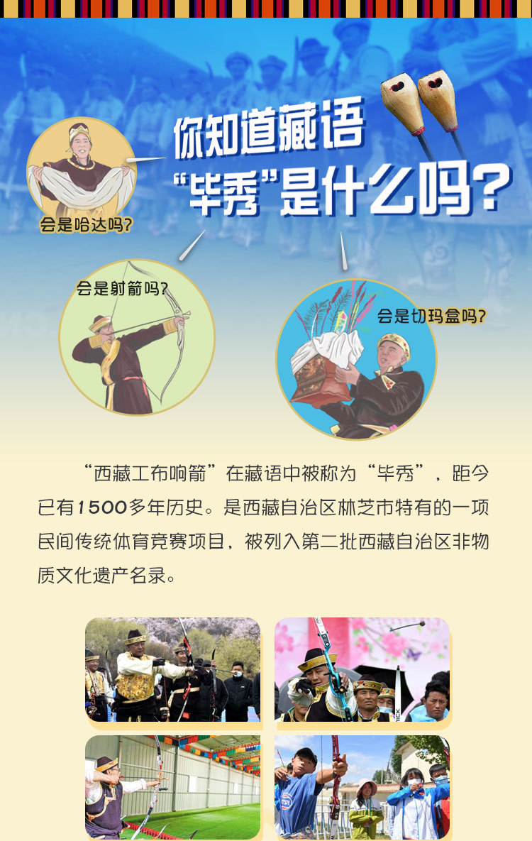 "西藏工布響箭"在藏語中被稱為“畢秀”,距今已有1500多年歷史。是西藏自治區(qū)林芝市特有的一項(xiàng)民間傳統(tǒng)體育競賽項(xiàng)目,被列入第二批西藏自治區(qū)非物質(zhì)文化遺產(chǎn)名錄。[詳細(xì)] -