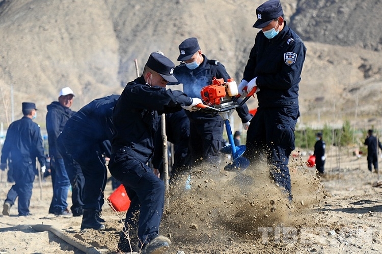 4月9日,民警們肩扛樹苗和鉆坑機(jī),手持鐵鍬和水桶,再次來(lái)到雅魯藏布江畔的沙漠地帶,開展義務(wù)植樹公益活動(dòng)。
