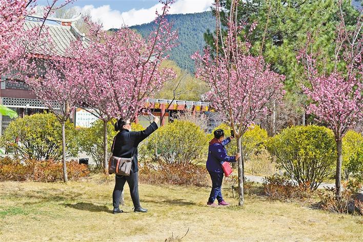 在林芝市福建公園一角,花開(kāi)燦爛,柳葉初萌,人們紛紛走出家門,來(lái)到公園欣賞美景。圖為群眾在樹(shù)下拍照留念。王珊 攝