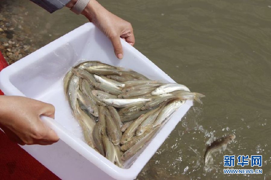 6月6日,當(dāng)?shù)厝罕妼⑶嗪:沲庺~(yú)苗投放到布哈河。新華社記者 周喆 攝