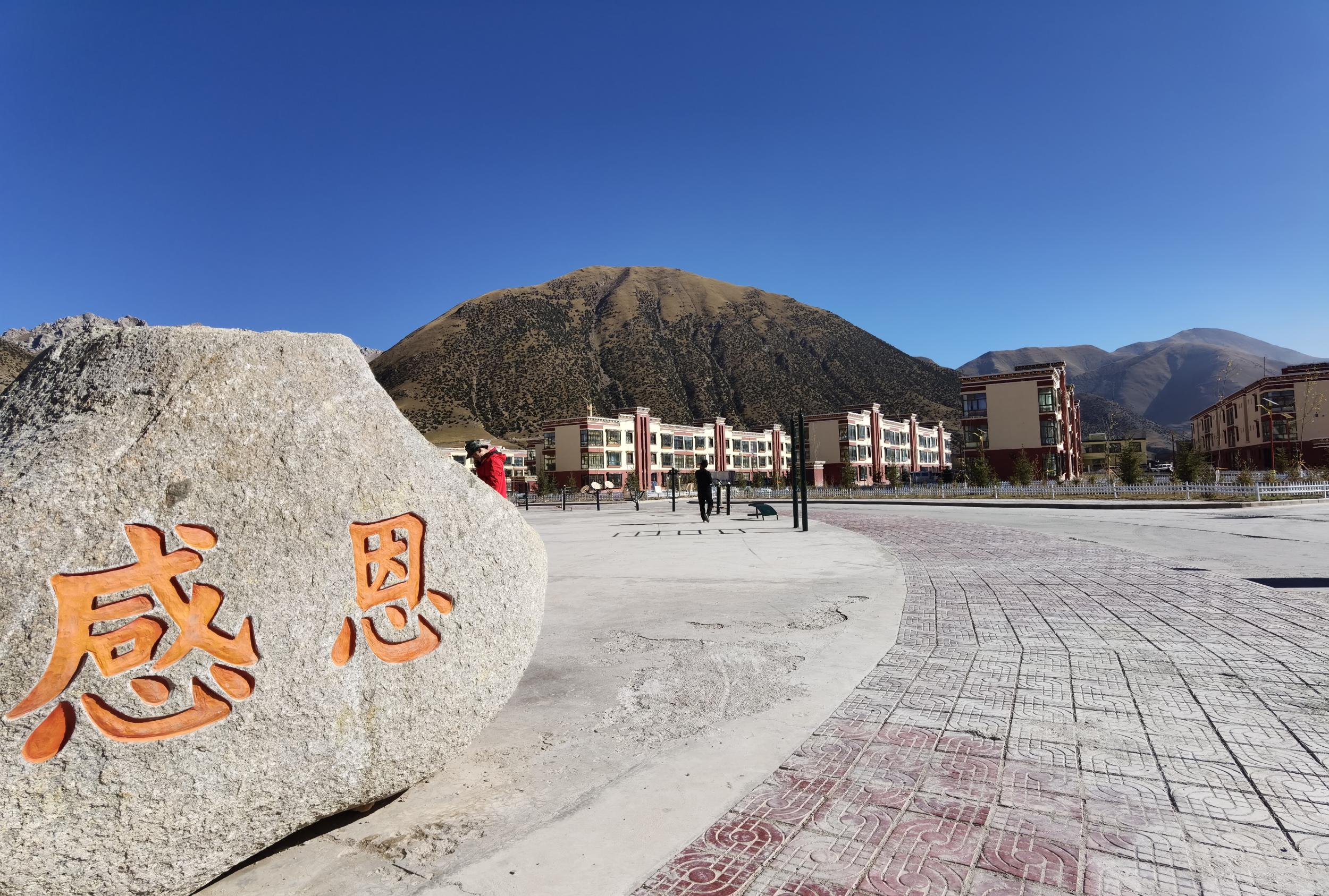 “牧民希望家園”小區(qū)內(nèi)的一個(gè)石頭上,“感恩”兩個(gè)紅色大字格外顯眼