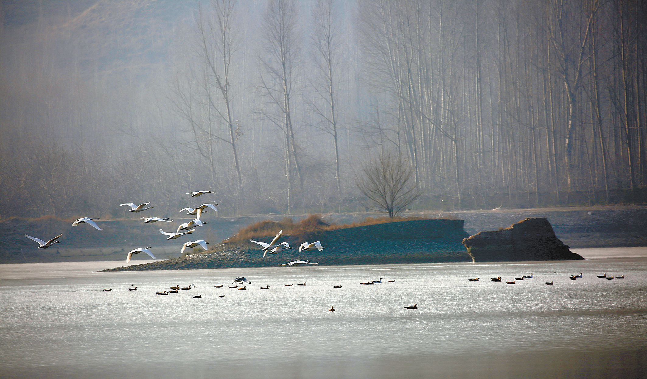 白天鵝學(xué)名叫大天鵝,屬國家二級保護(hù)動物,它們每年11月離開繁殖地遷往溫潤的南方過冬,遷徙時常成6-20多只的小群或族群遷徙,過去幾乎罕見在我們青海的黃河等水域棲息過冬。近年來,隨著三江源黃河水系生態(tài)環(huán)境的不斷改善,以往不曾見過的珍禽水鳥頻頻光顧黃河等水域安家落戶,這些水鳥中有白鷺、綠頭鴨、赤嘴潛鴨、白骨頂?shù)日淝?,多達(dá)10余種,而白天鵝很少來“做客”棲息。
