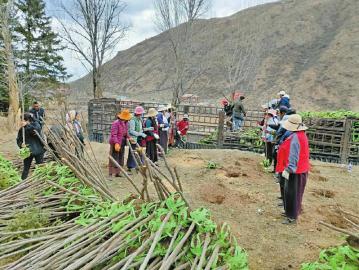 爐霍縣斯木俄米脫貧攻堅造林專合社組織村民下苗,準(zhǔn)備栽種。 (爐霍縣林草局供圖)