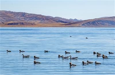 羊卓雍錯(cuò)自2014年被納入國家良好湖泊生態(tài)環(huán)境保護(hù)試點(diǎn)工程項(xiàng)目以來,羊卓雍錯(cuò)周邊生態(tài)環(huán)境持續(xù)向好,棲息繁衍的野生動(dòng)物數(shù)量逐年增多。這是近日拍攝的羊卓雍錯(cuò)湖面上的水鳥。新華社記者 孫非 攝