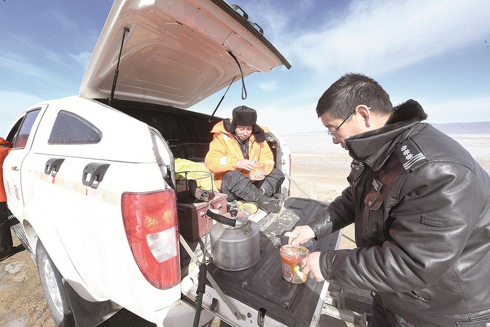同事們前去巡查后不久,她們也開始忙碌起來(lái),為隊(duì)員們準(zhǔn)備“豐盛的午餐”——泡面。平常再簡(jiǎn)單不過(guò)的燒開水,在寒風(fēng)凜冽的青海湖邊卻異常艱難。