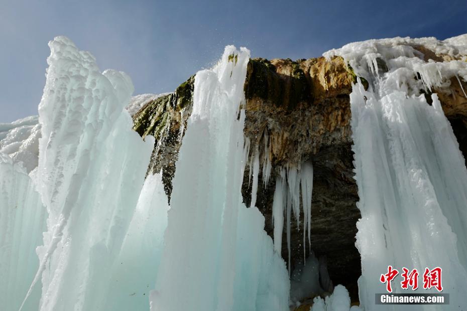 2021年1月23日,祁連山國家公園崗什卡雪峰山腳下的七彩冰瀑,由于溪水中含有多種礦物質,在冬日暖陽的照耀下,散發(fā)出五彩繽紛的綺麗風光,蔚為壯觀。中新社發(fā) 成 林 攝