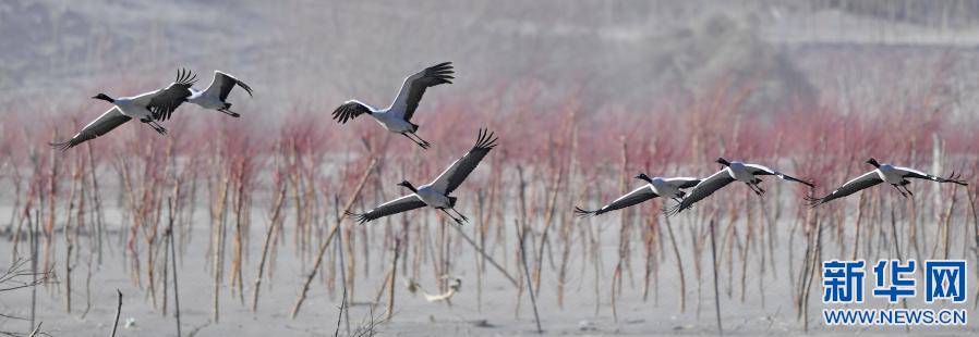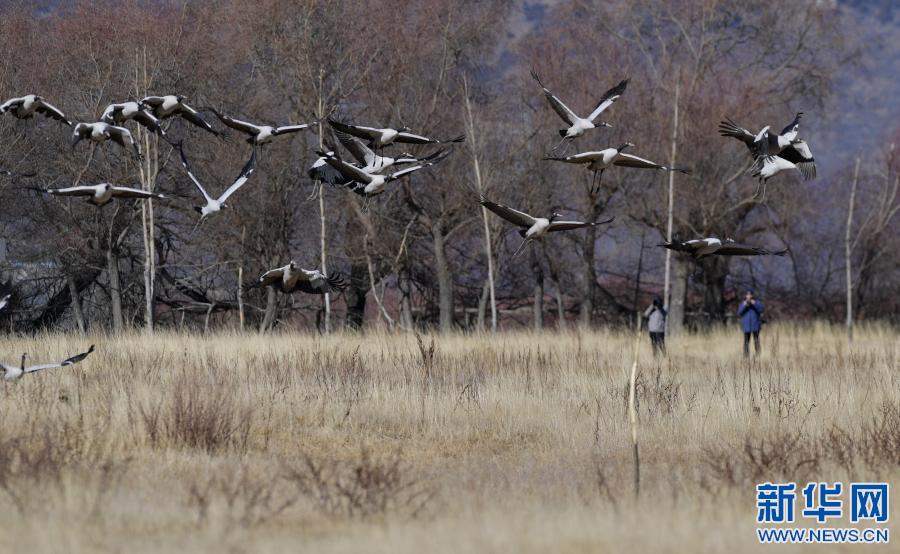 冬季,成群結(jié)隊(duì)的黑頸鶴遷徙到西藏林芝市,雅魯藏布江及江畔的農(nóng)田成了它們越冬的樂園。