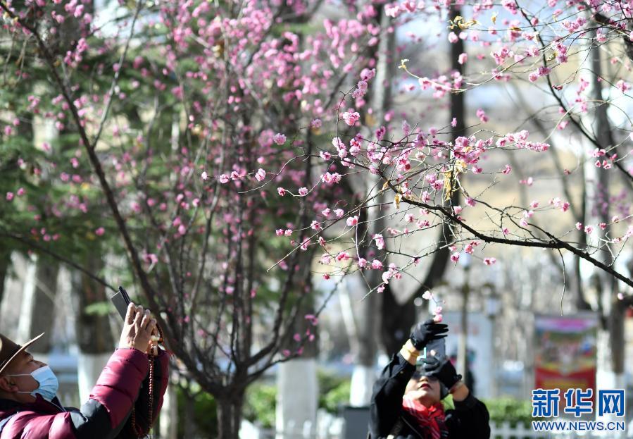 3月4日,人們?cè)诶_龍王潭公園賞花、拍照。新華社記者 覺果 攝