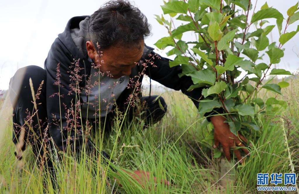 索朗羅布在檢查樹的長勢(2020年8月8日攝)。新華社記者 覺果 攝