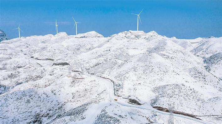 雪后的貴州盤(pán)縣四格風(fēng)電場(chǎng)(2021年1月12日攝,無(wú)人機(jī)照片)。 新華社記者 陶亮 攝